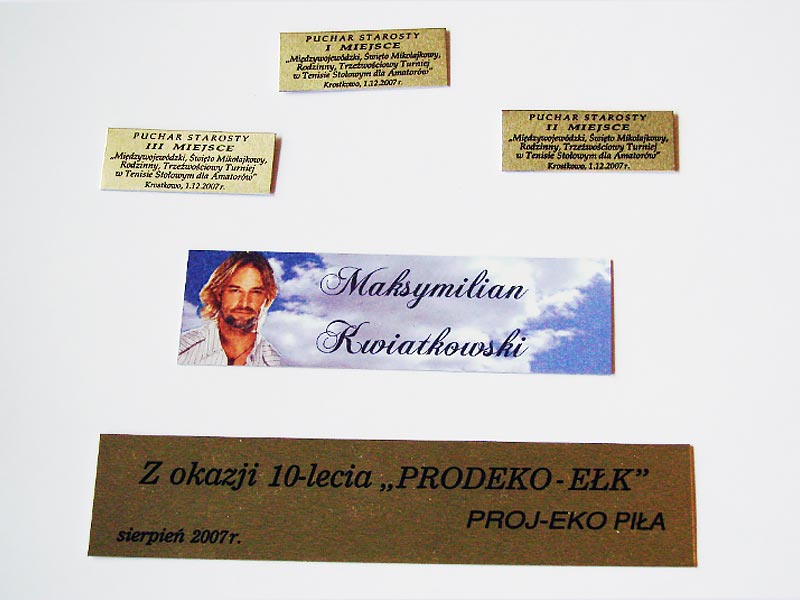 Ponadto produkujemy tabliczki znamionowe, opisowe, na puchary, na drzwi, szablony do malowania, breloki, numerki do kluczy.